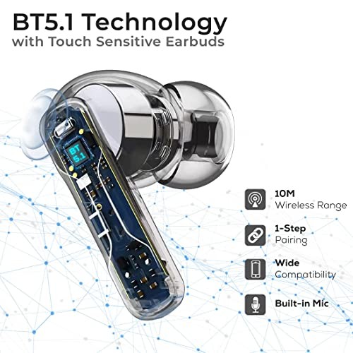 • Ergonomic, lightweight & Touch Control earbuds with BT5.1 chipset ensure quick pairing, seamless connection, 1-step pairing, auto-reconnect and wide compatibility with Bluetooth-enabled smart devices.